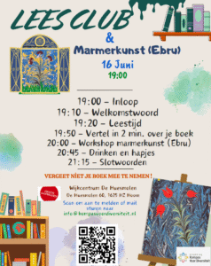 We hebben een leuke activiteit in Husmelon Wijkcentrum om onze traditionele boekenclub te combineren met marmerkunst (Ebru). We nodigen iedereen uit om mee te doen. Als je wilt deelnemen, stuur ons dan een e-mail naar info@kompasvoordiversiteit.nl en wees welkom. Het is zo spannend om erbij te zijn. Drankjes en hapjes zullen er ook zijn, en je kunt een mooie Ebru maken.